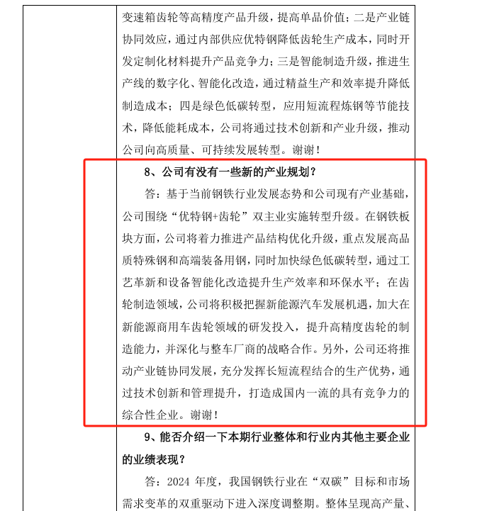 基于當前鋼鐵行業發展態勢和公司現有產業基礎,公司圍繞“優特鋼+齒輪”雙主業實施轉型升級。在鋼鐵板塊方面,公司將著力推進產品結構優化升級,重點發展高品質特殊鋼和高端裝備用鋼,同時加快綠色低碳轉型,通過工藝革新和設備智能化改造提升生產效率和環保水平;在齒輪制造領域,公司將積極把握新能源汽車發展機遇,加大在新能源商用車齒輪領域的研發投入,提升高精度齒輪的制造能力,并深化與整車廠商的戰略合作。另外,公司還將推動產業鏈協同發展,充分發揮長短流程結合的生產優勢,通過技術創新和管理提升,打造成國內一流的具有競爭力的綜合性企業。