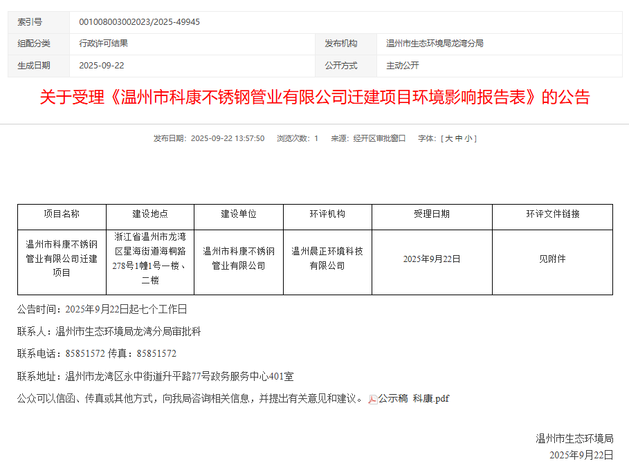 2025年9月22日,溫州市生態環境局受理溫州市科康不銹鋼管業有限公司遷建項目環境影響報告表并對外進行公告,公告期:7個工作日。