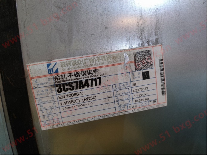 2024年3月12日佛山市場訊, 又是本網周庫存盤點時,在某倉庫,有一鋼種吸引了大伙兒的注意,一鞍鋼聯眾的冷軋鋼卷標簽有點特別。只見其鋼種一欄赫然寫著:1.4016(C)(RR34)。