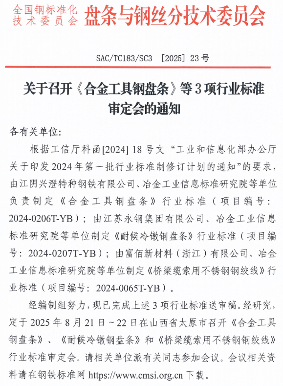 2025年8月4日,由由富佰新材料(浙江)有限公司、冶金工業信息標準研究院等單位制定《橋梁纜索用不銹鋼鋼絞線》等3項行業標準已完成標準送審稿,將于2025年8月21日-22日在山西省太原市召開業標準審定會。